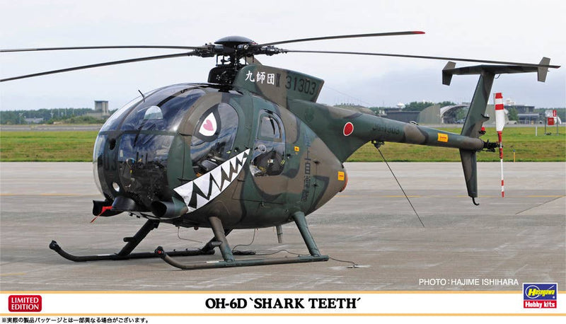 Hasegawa's 1/48-scale model kit of the OH-6D in its "shark teeth" markings includes decals for its distinctive livery that really makes it stand out! Resin parts are included for the lights, FLIR, antenna and more. Decals for the aircraft numbered JG-1303 belonging to the 9th Squadron, Japan Ground Self-Defense Force (Garrison Hachinohe, September 2011), are included.