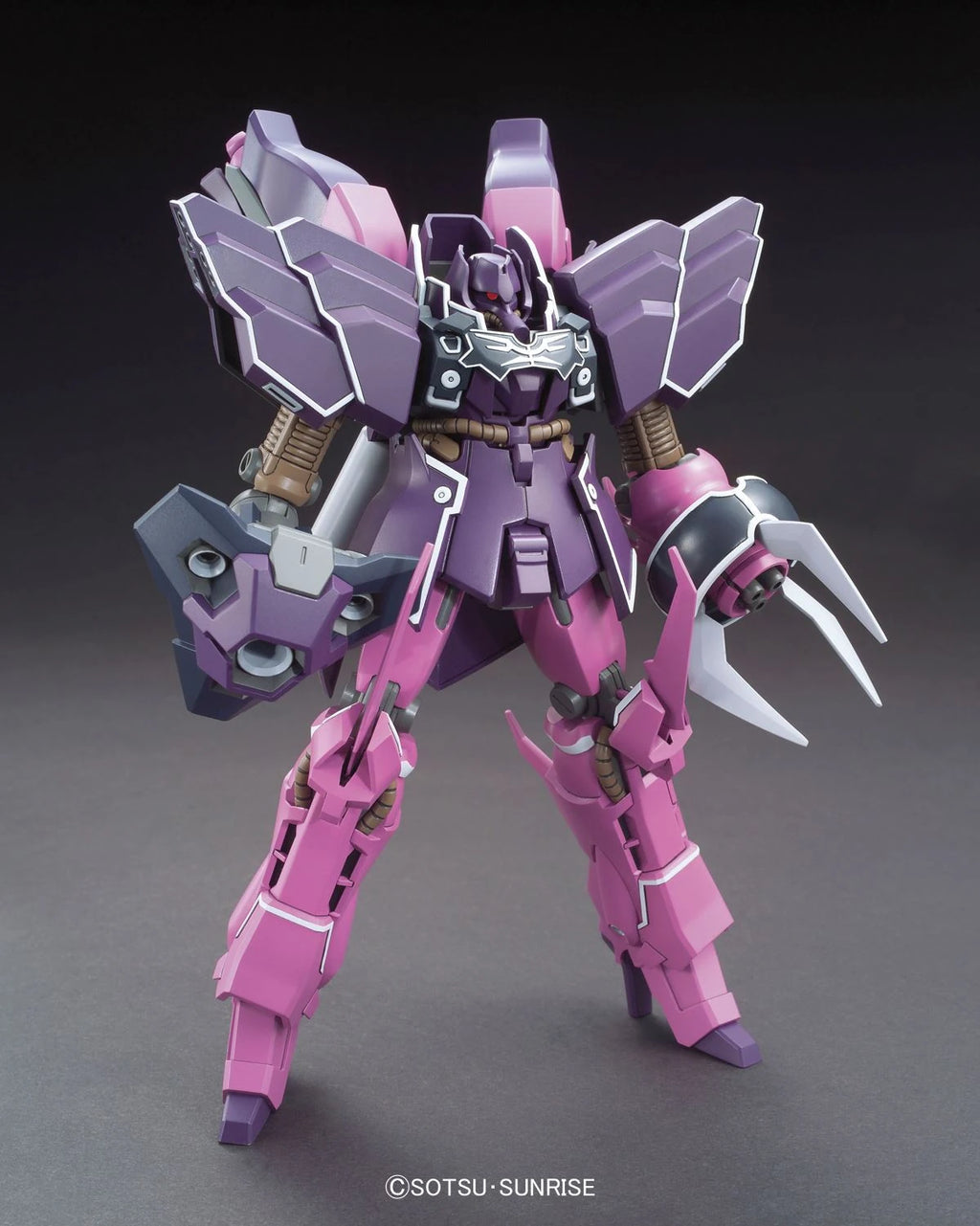 The Rozen Zulu is seen here as it appears in Episode 7 of "Gundam Unicorn." The right arm is different from the earlier release of this kit to reflect its appearance in the show. The two binders on the back will open and close; six Psycho Jammers are included, as are two of the three twin mega particle cannon, six of the InComm mega particle cannons in extended form, six of the same weapon in folded form, a shield, four InComm leads, and four stands for them.
