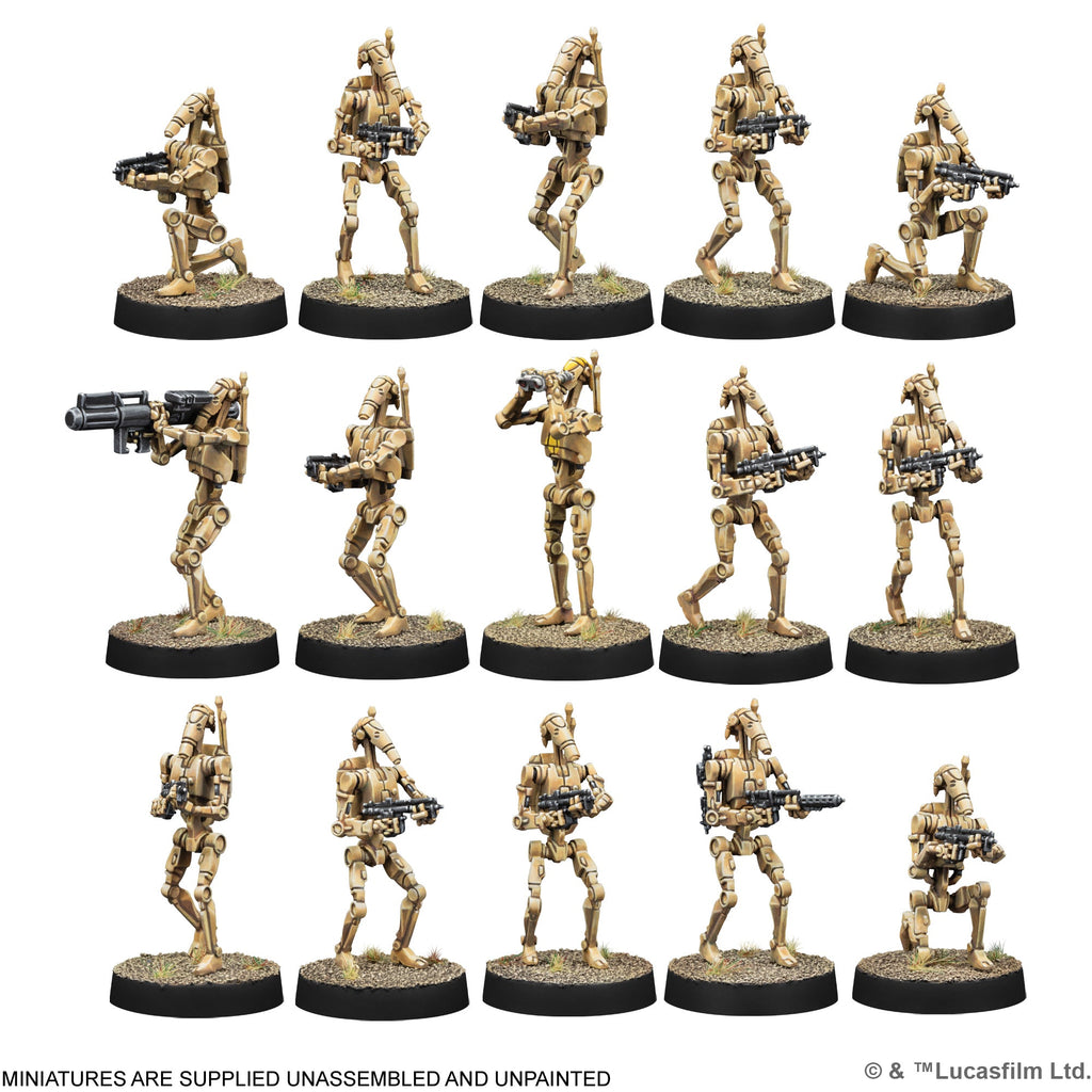 This Star Wars TM: Legion B1 Battle Droids expansion contains: 1 B1 Battle Droid Unit Leader, 12 B1 Battle Droids, and 2 B1 Battle Droid heavy.