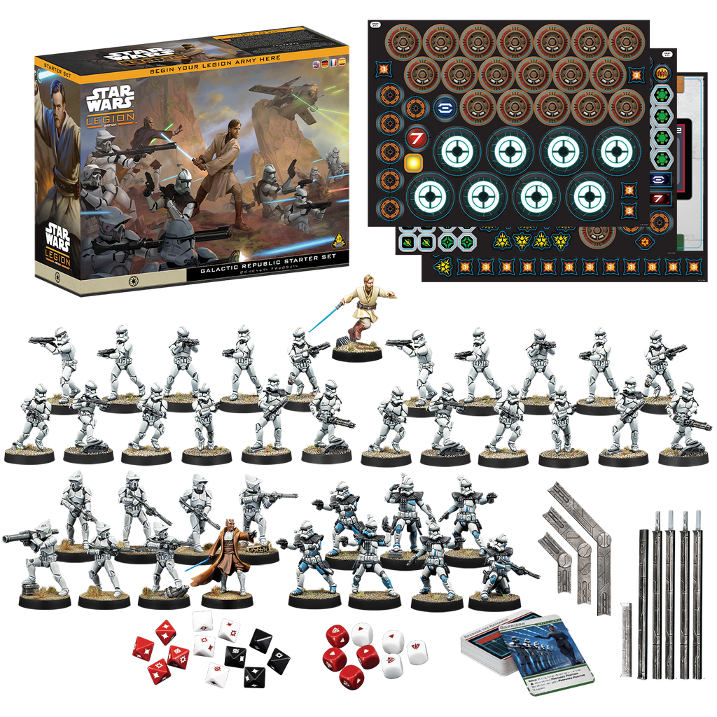 The Galactic Republic Starter Set contains a 600-point Recon-level army and all the dice, templates, tools, and tokens a player needs to begin playing their first games of Star WarsTM: Legion. When a player is ready for even bigger games, this starter serves as an ideal starting point for players to expand and customize their armies with additional units from other Star Wars: Legion unit boxes.