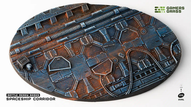 This blister contains 1 thermoplastic 170mm wide oval Battle Ready Base, in a Spaceship Corridor theme.