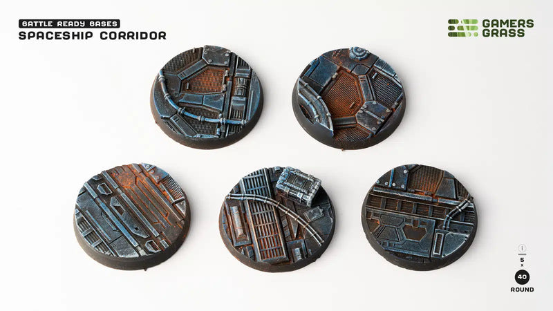 This blister contains 5 thermoplastic 40mm wide round Battle Ready Bases, in a Spaceship Corridor theme.