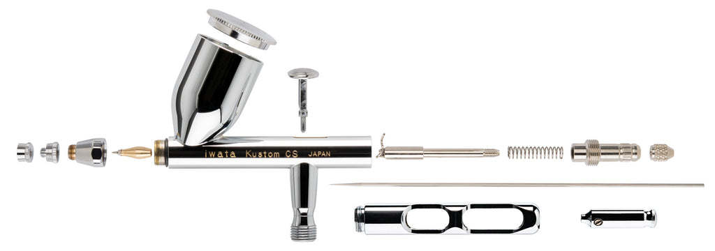 Iwata Eclipse Series airbrushes feature an exclusive Compression Fit Nozzle that is easy to clean and assemble. It is secured by the head cap—no threading necessary. Iwata's spring-steel needle resists breakage, and the needle packings are solvent-resistant PTFE for longevity. Additional accessories include a head cap spanner for removing the head cap when accessing the nozzle, as well as Iwata Lube for lubricating the needle and main lever mechanism. The Vault Iwata Kustom CS also includes a Pistol-Grip Moisture Filter to deliver clean, dry air and a taller Main Lever for extreme control of paint flow. Hugely popular, Iwata Eclipse Series airbrushes offer all-star versatility.