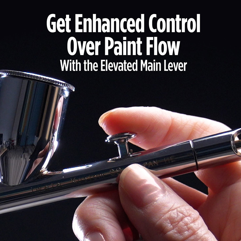 Unique features include a generous 0.5 oz / 15 ml fluid cup with a lid, perfect for medium to large scale applications, allowing for uninterrupted creativity without the need for constant refilling. The Main Lever is elevated, and the Rapid Access Handle enhances the convenience and functionality of your airbrush, by making certain tasks quicker and easier. It’s dual cutaway design saves time and increases efficiency by providing easy access to the Needle Chucking Nut and Needle Grip. This is convenient for several reasons -